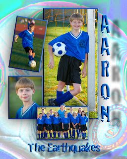 While I have not entered the realm of team sports photography, I was once asked by my son's soccer coach to photograph the team as she didn't want the "usual team type pictures". It's not always the photographers fault they're so bad. Color labs that print sport photos often have cheesy templates with an image of a football, soccer ball, baseball glove and so on. Somewhere on the template the photographer types in 'Johnny Smith' followed by 'The Razors'. All the photographer has to do is to drop in the images of the team and the individual player and presto, team photo. I wanted something different for Patrick and his team and while it required a bit more work, I think I managed to pull it off. His team was called 'The Earthquakes', so I used a font to match the team name. In this case I used 'Cracked'. I also have the background of a soccer ball or net. The individual photo is larger than the team. C'mon, think about it, we don't always know the other kids so why not make our child stand out a bit more. And let's face it, they're kids and they don't always like getting their picture taken. Why have a posed photo of them looking so stoic. I think you'll see by the photos that there is indeed, a better way. And the second photo I added is an example of something you're more likely to see, and no, I did not take that photo. Maybe here at Spotlight Photography, we ought to do team photos, I guarantee you won't see anything else like it.